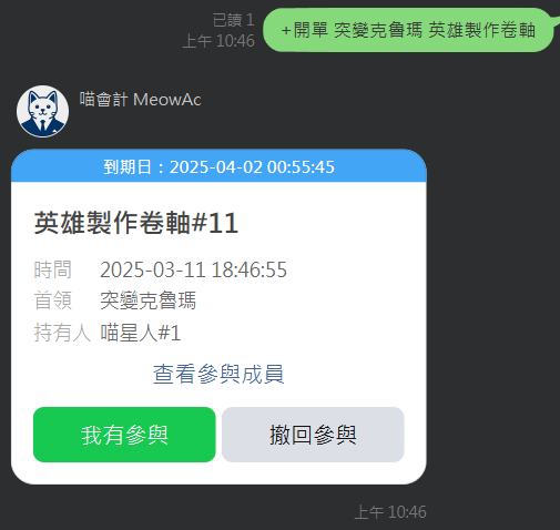 請由道具的拾取人進行開單,開單人會自動登記成參與者,其他有參與打王的角色必須點擊 我有參與 進行登記,必須登記參與後續才會進行分鑽,登記後可以點擊 查看參與成員 來確認是否成功登記,誤點時也可以點擊 撤回參與 來撤回登記。